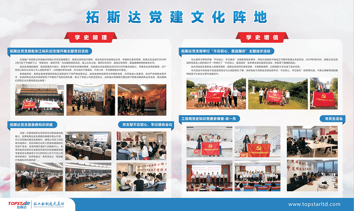公司董事长吴丰礼先生曾在广东省委举办的企业家座谈会上说道,“我自己从军营出来,一直坚信做人要有点信仰,做企业更要有点信仰。目前拓斯达党支部已有71位党员,他们像一个个小太阳,把红色信念传递出去,影响着身边的同事向优秀看齐。每当有什么困难,党员总是第一时间带领大家冲上去。”