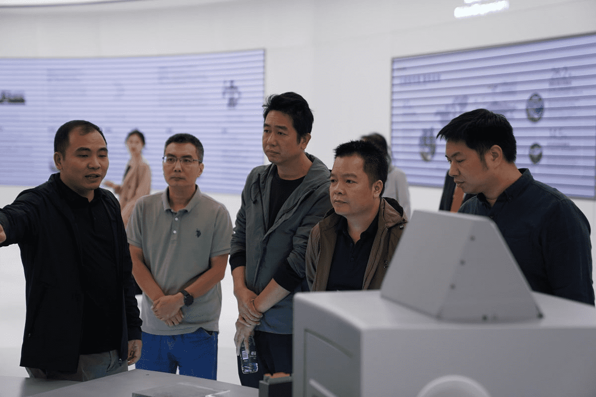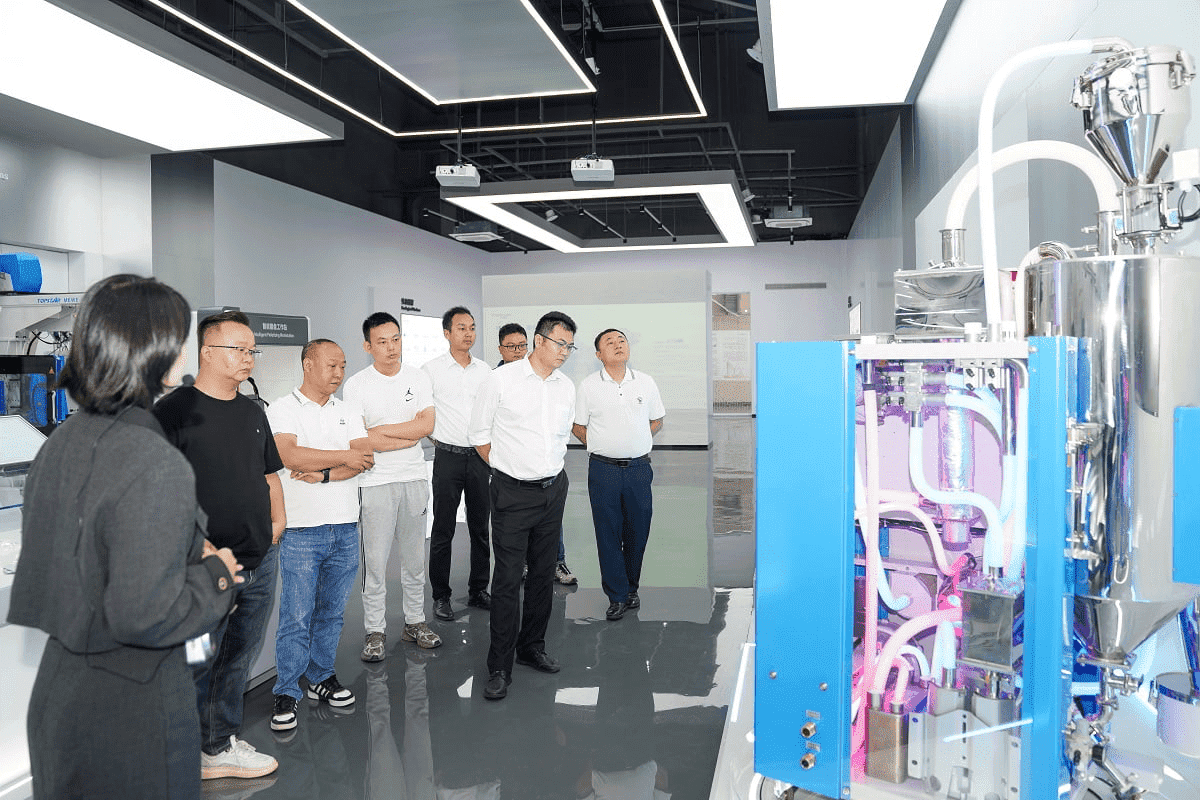 在智能裝備總部基地的展廳,客戶實地參觀覆蓋“拆包卸垛-中央供料-智能水電氣-注塑成型”的智能產線,直觀感受智能整廠如何高效、協同運作。