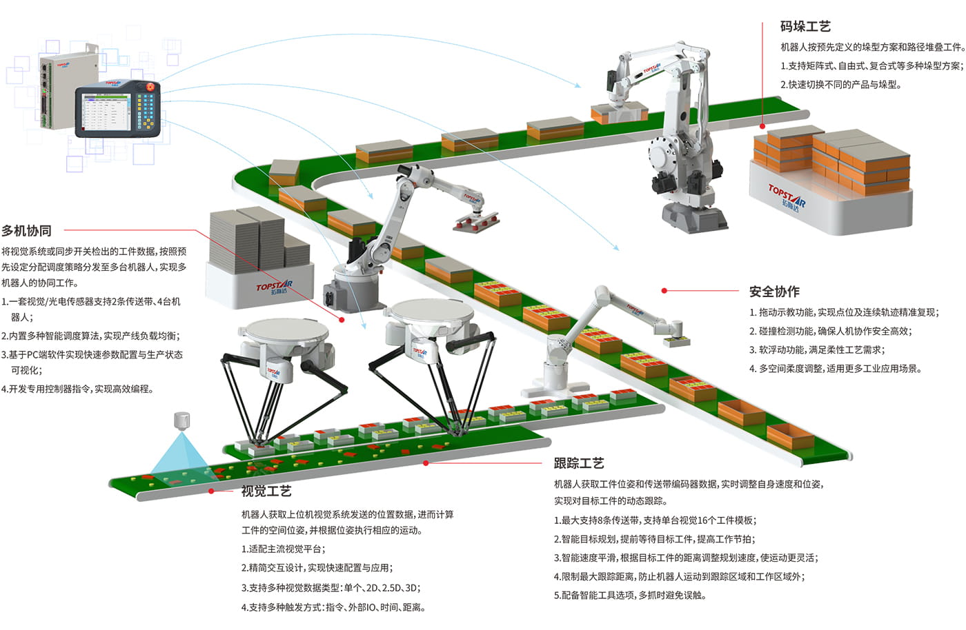 5、豐富的運動學和動力學算法庫:系統可以適配通用六關節、Delta、SCARA、四軸搬運以及各種非標結構的機器人。